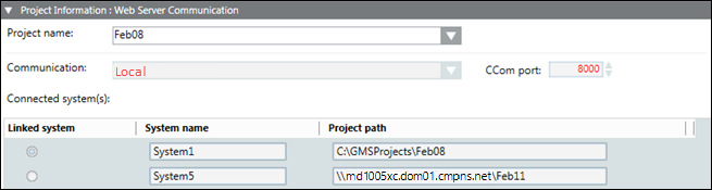 This expander allows you to select and link a project on Server to the web application. Depending on the Server project selected, the communication mode, the CCom port number, the system name, project path are automatically set. You cannot edit them here.