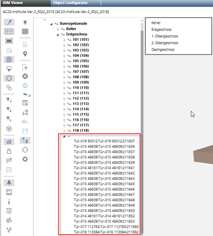 - Only equipment that can be assigned to any room is currently supported by the BIM Viewer. This assignment is performed using a “containment” strategy, i.e. the BIM Viewer tries to find the room that (geometrically) contains the equipment. If the equipment is outside of any room, it is skipped.